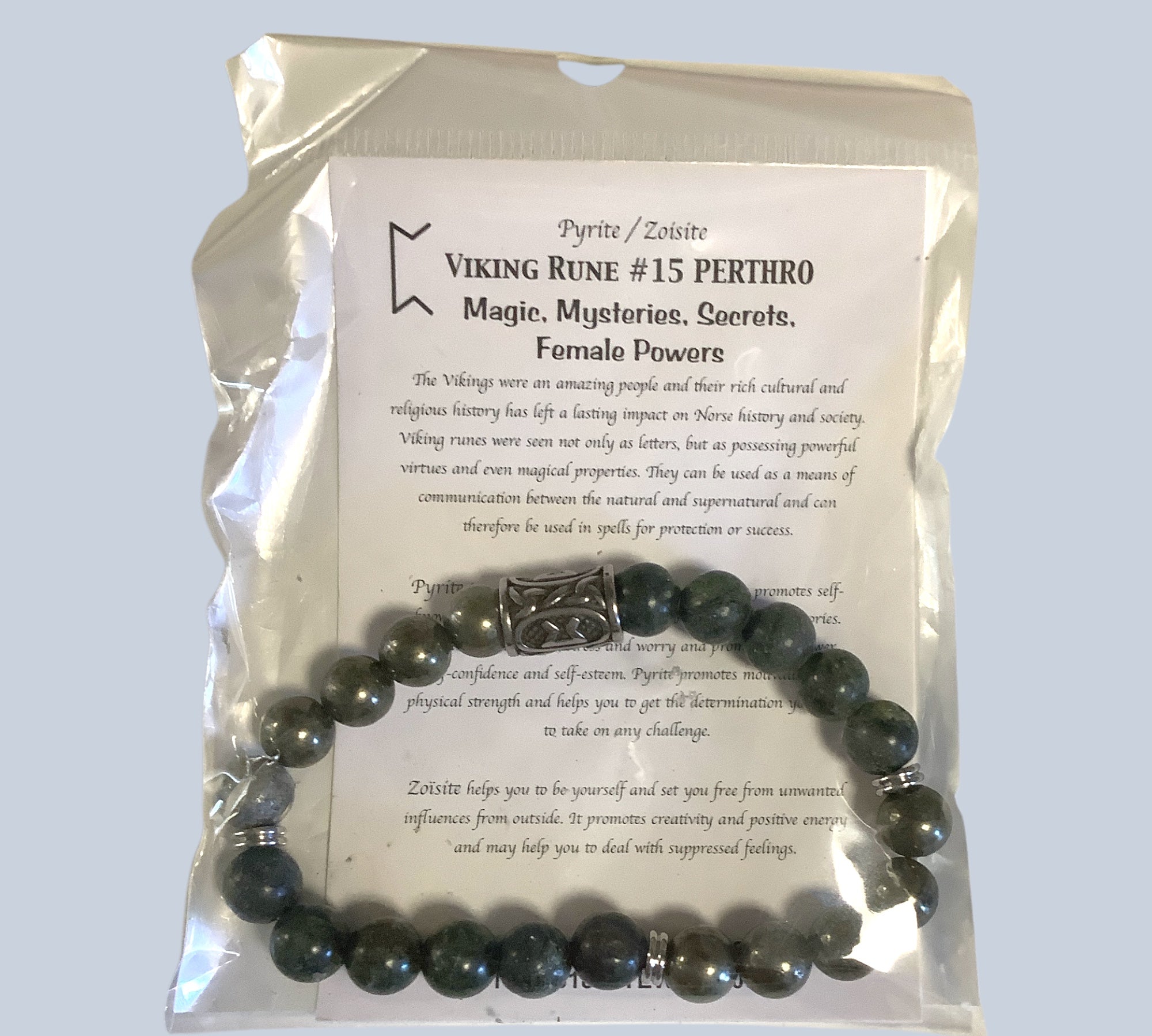 Unleash your inner strength with the Viking Rune Bracelet Perthro. Crafted with powerful zoisite and adorned with ancient Viking symbols, this bracelet is infused with magic, mystery, and female empowerment. Embrace creativity and positivity as you tap into the hidden secrets of the runes. Perfect for anyone seeking to harness their inner potential.